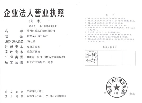 隨州市威龍礦業(yè)有限公司位于湖北省隨州市西北部,地處鄂豫兩省四縣市結(jié)合部,隨州市隨縣吳山鎮(zhèn)境內(nèi)。公司占地38900平方米,新新、新唐公路從中穿過(guò),南與316國(guó)道及漢丹鐵路線相鄰,西與新桐道312國(guó)道相連,交通便利,基礎(chǔ)設(shè)施齊全,通信便捷。