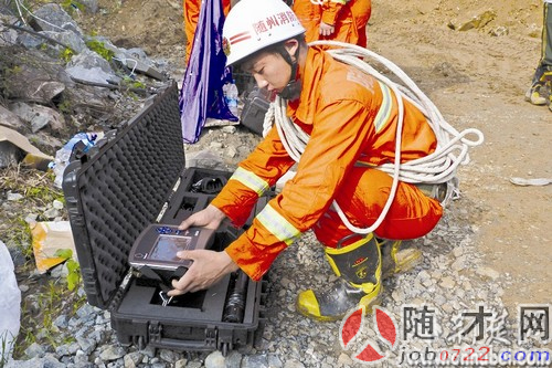 圖為救援人員正在用生命探測儀搜救