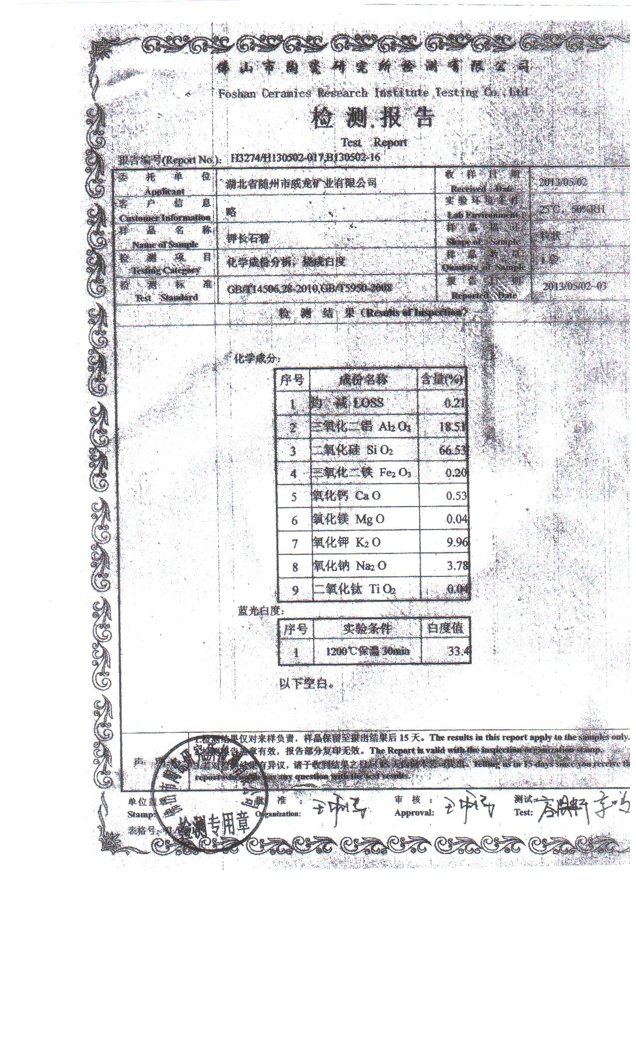 鉀長石粉檢驗報告: